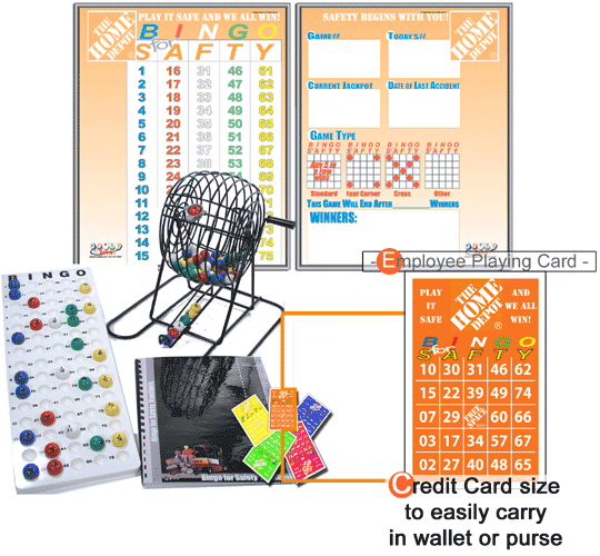 Customize the Bingo for Safety Kit with your company logo and colors. We have a large selection of stock company kits, or can custom design a kit for your company for a small additional setup fee. Select from some of the more popular available designs from the drop-down box below. If you do not see your company, please call. This is only a small sample of available companies. The Kit includes a Dry-Erase Masterboard, a Dry Erase Game Status Board with the company logo and colors, a comprehensive Safety Incentive Bingo Program Manual, a Bingo Cage with Balls and Masterboard for picking the numbers, and 1500 special wallet size SAFTY Bingo cards.