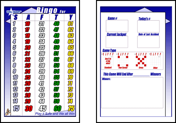 Uniquely personalized safety bingo Masterboards and Status Boards for your company. Complete with your company colors and logo. The set consists of a BINGO for SAFETY MASTER BOARD for keeping track of the numbers called for the current game, and a BINGO for SAFETY STATUS BOARD to record information about the current game. There are places to fill in the game number, the current jackpot, the bingo number called that day, how many winners allowed for the current game, and the name(s) of the winner(s). The Status Board also has sample bingo cards to show what type of game is being played - Standard Bingo, Four Corners, Cross or some other variation which can be marked on the blank Bingo card on the poster.